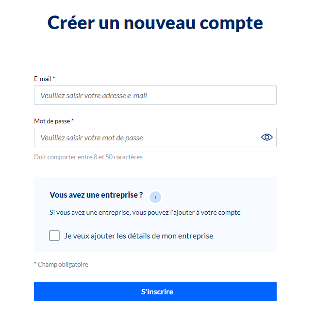 Pour vous inscrire en tant que client particulier, il vous suffit de saisir votre adresse électronique et un mot de passe, puis de cliquer sur "S'inscrire". Si vous souhaitez ajouter vos données professionnelles à votre compte et vous inscrire en tant que client professionnel, cochez la case correspondante et cliquez sur "S'inscrire".