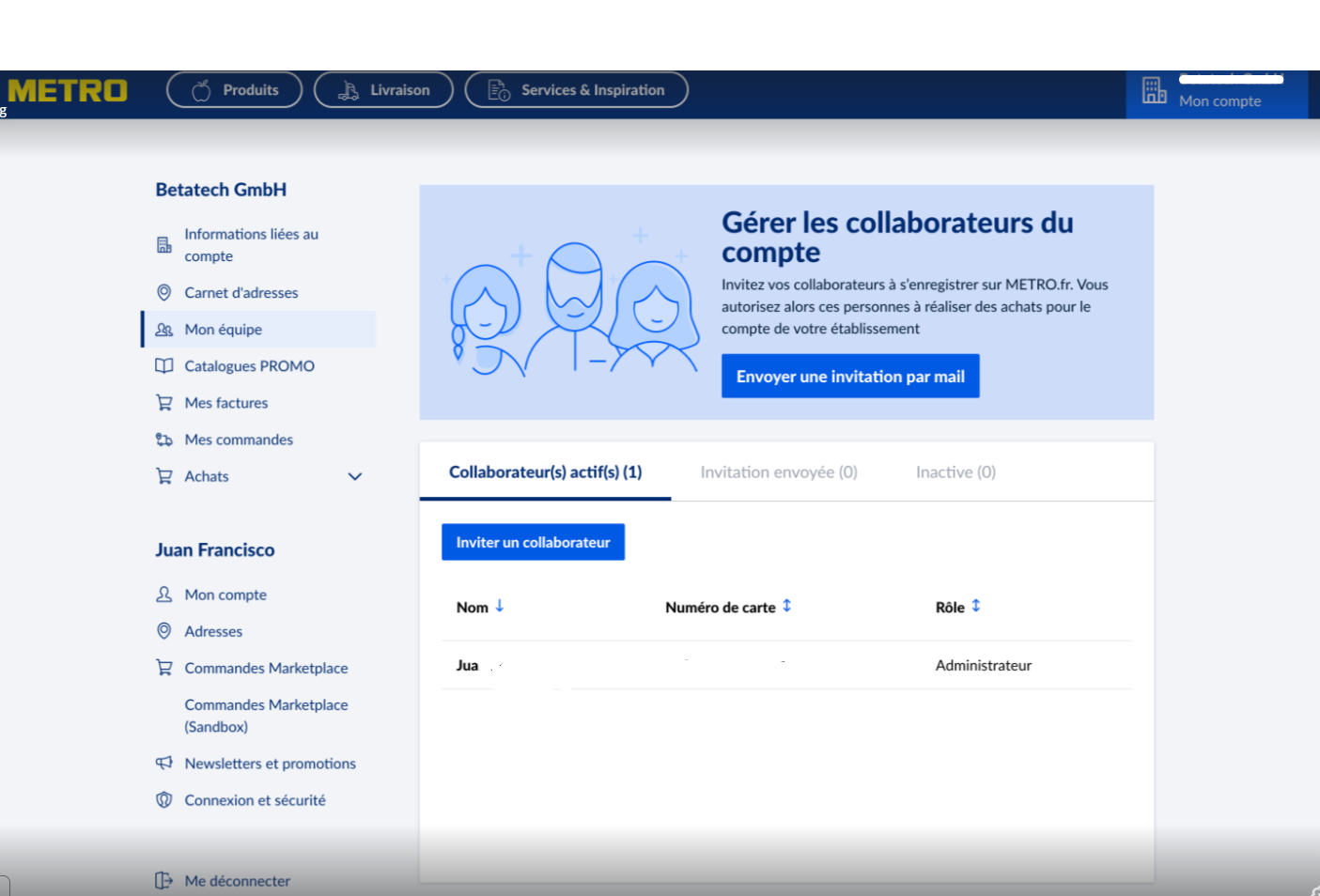 Envoyer vos commentairesEn tant que client professionnel, vous avez la possibilité d'inviter vos employés à accéder à votre compte client sur la Marketplace METRO.
